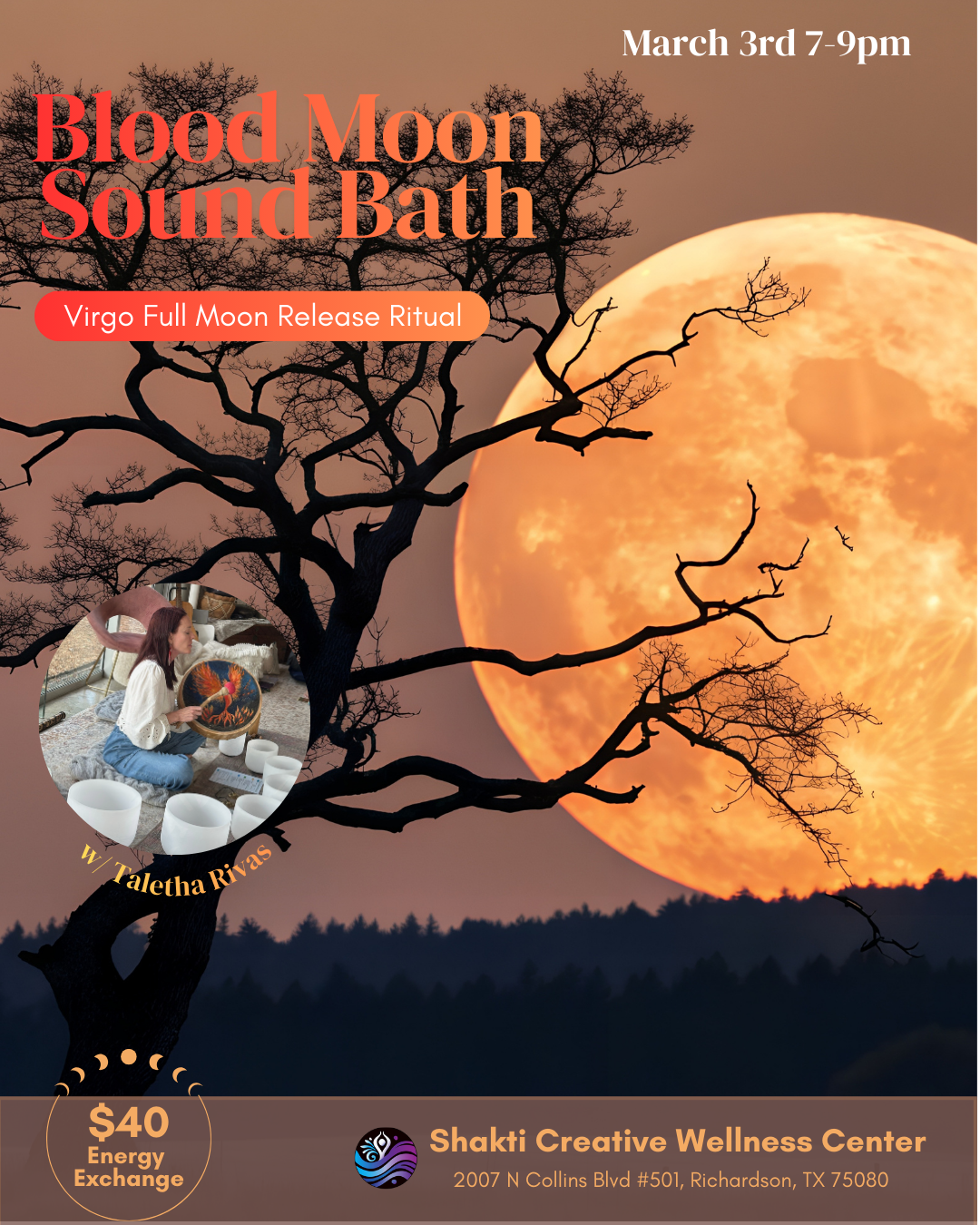 Experience the grounding, transformative energy of the Virgo Blood Moon at Shakti Creative Wellness Center. Join us on Sunday, March 3rd, from 7–9 PM for an evening of sound, ritual, and intention.
